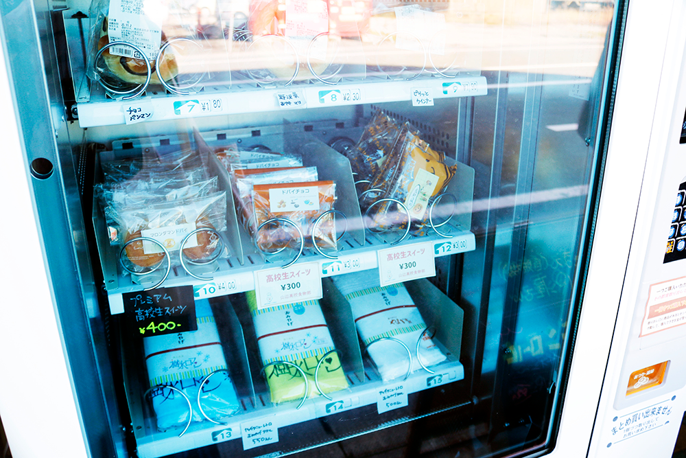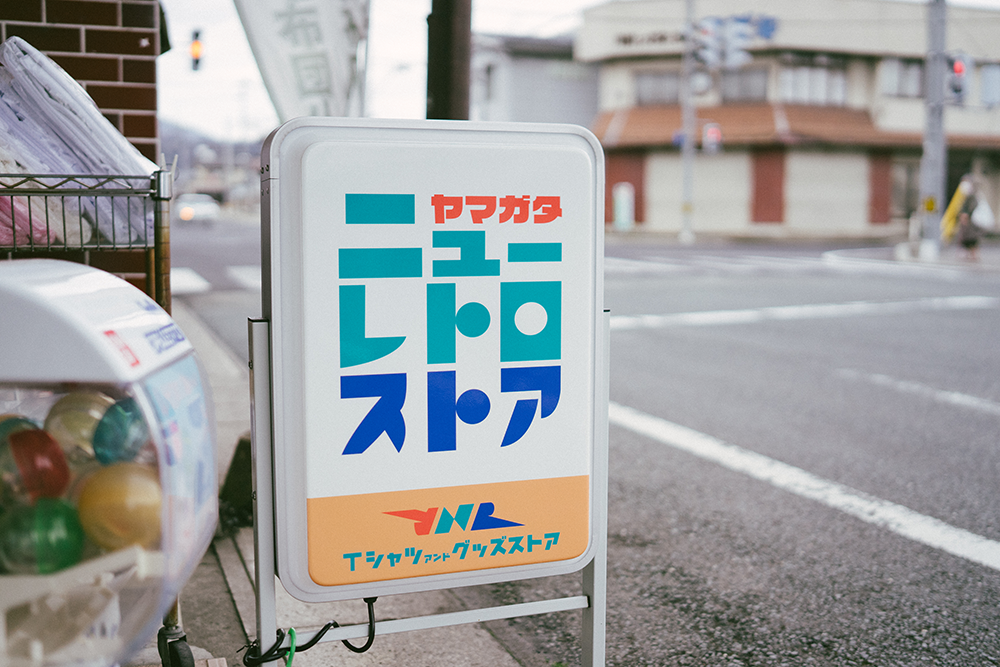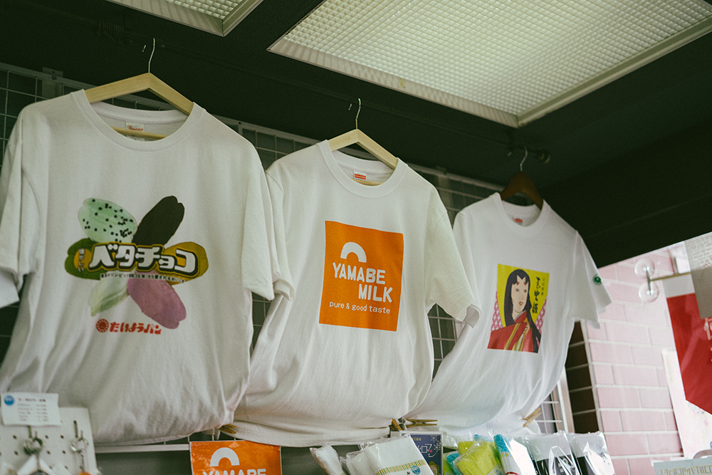 山辺駅前にある石沢布団店は、旅の合間に立ち寄れるスポット。店頭には、高校生スイーツが購入できるパンの自販機があり、ちょっとしたお土産もゲットできます。店内には町内外の老舗企業とコラボしたレトロなロゴのTシャツやグッズも揃い、布団店ながら遊び心あふれる空間が広がっています。