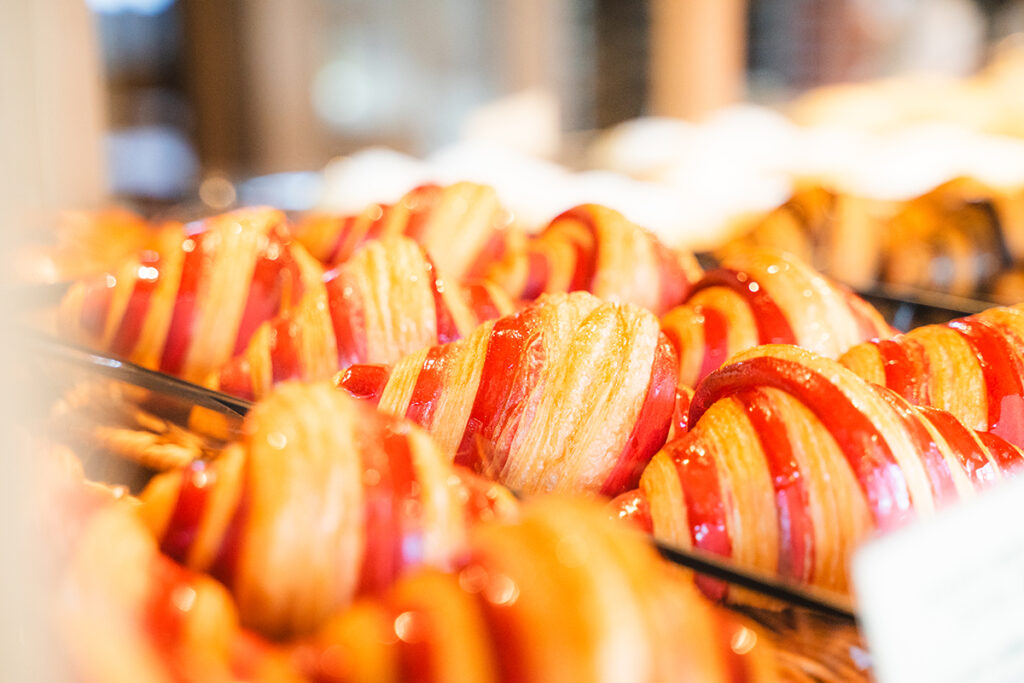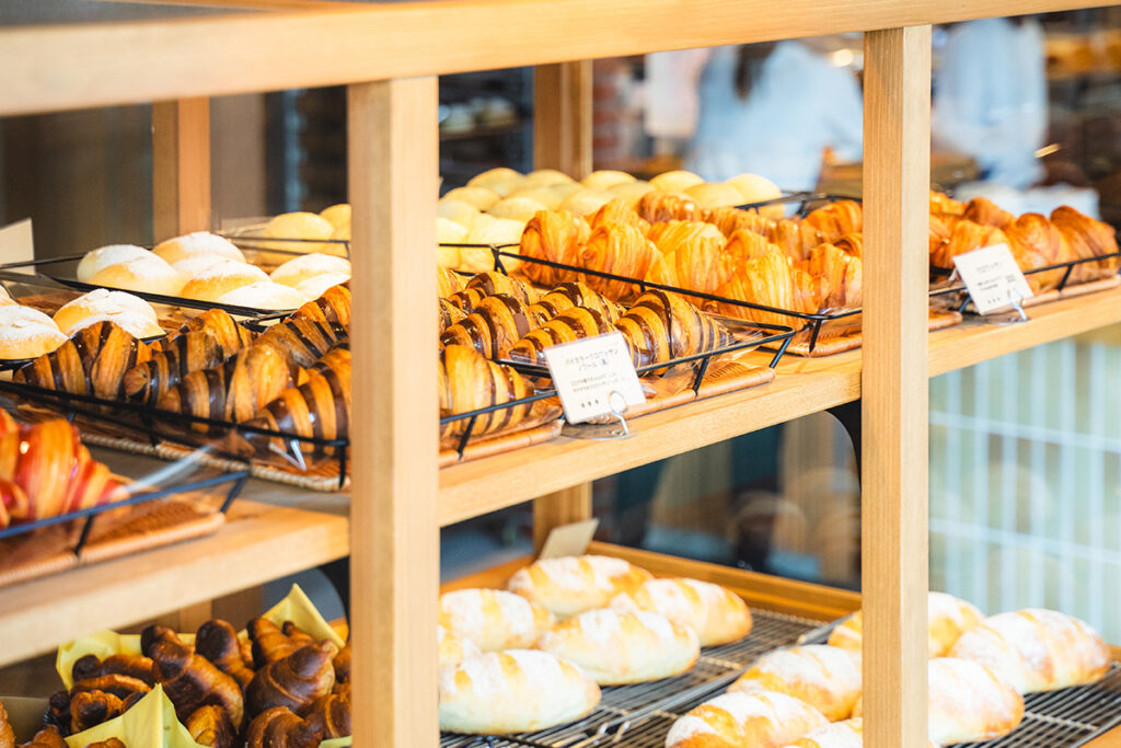 “パン屋さんの家”を意味する CHEz LePain では、食パンやフランスパン、惣菜パンなど約40種類が並びます。国産小麦と自家製自然酵母、そして丁寧に作られたフィリングが織りなすやさしい味わいが人気。やまべ牛乳など、地元の素材を使ったラインナップも楽しみのひとつです。
